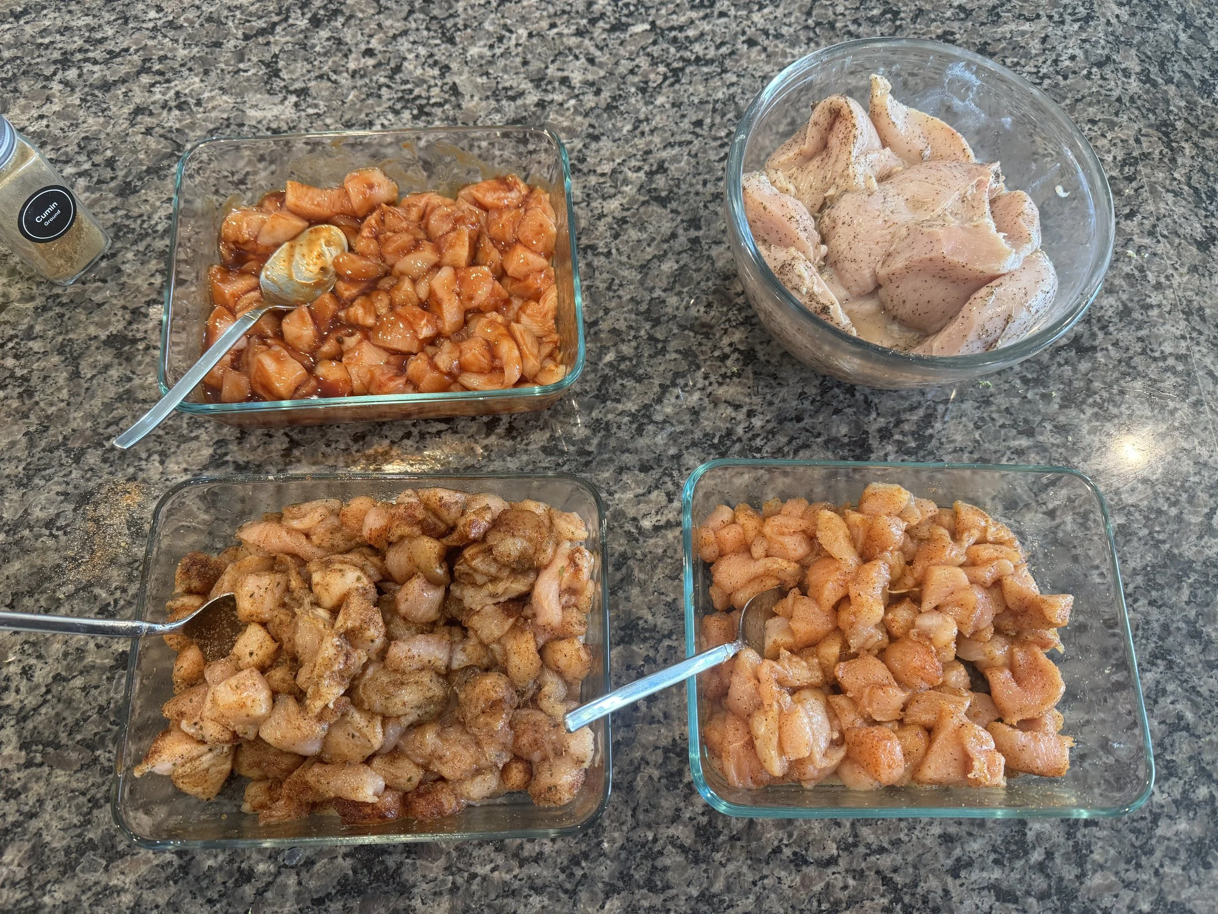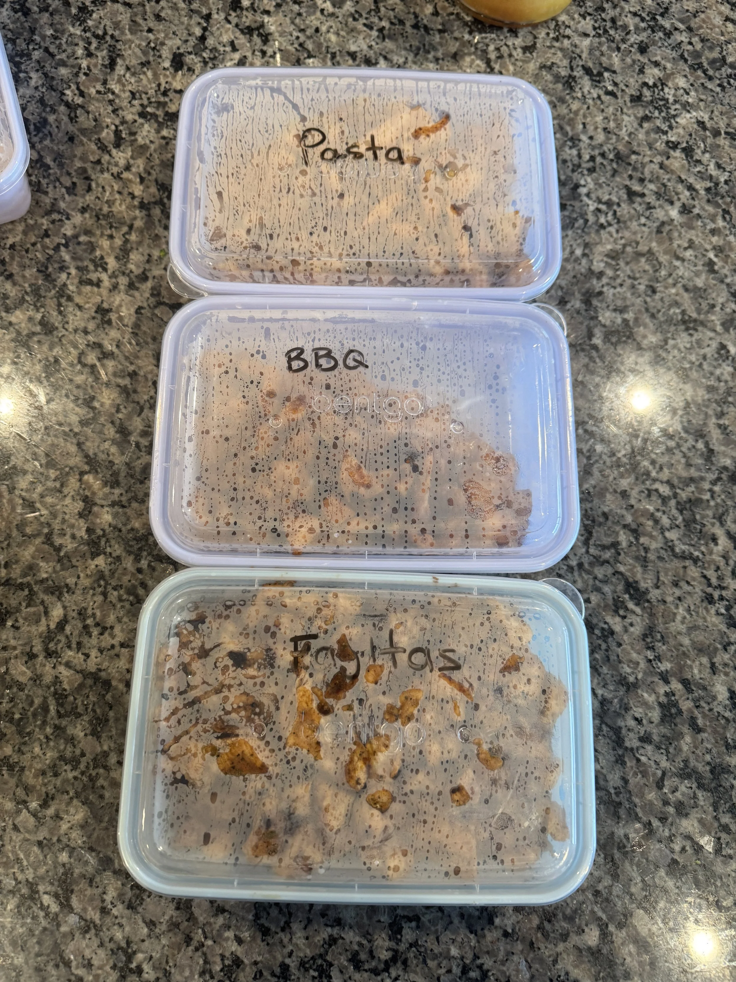 All the chicken for the week with the various seasonings so we have variety! Top left BBQ, top right lemon pepper, bottom left fajita/taco flavoring and bottom right is Wood Fired Garlic Kinder seasoning. You can make any seasoning combinations you would like.