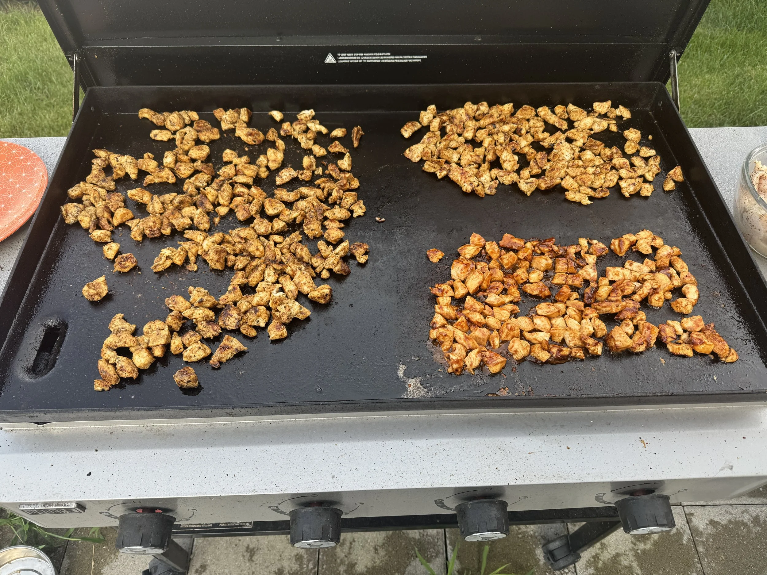 Cooking all your chicken for the week in one night is a great way to save time and ensure you have ready-to-eat meals at your fingertips. We cooked all our meat on the flat top grill but with different flavorings. Divide your chicken into five. You can use your favorite seasonings!