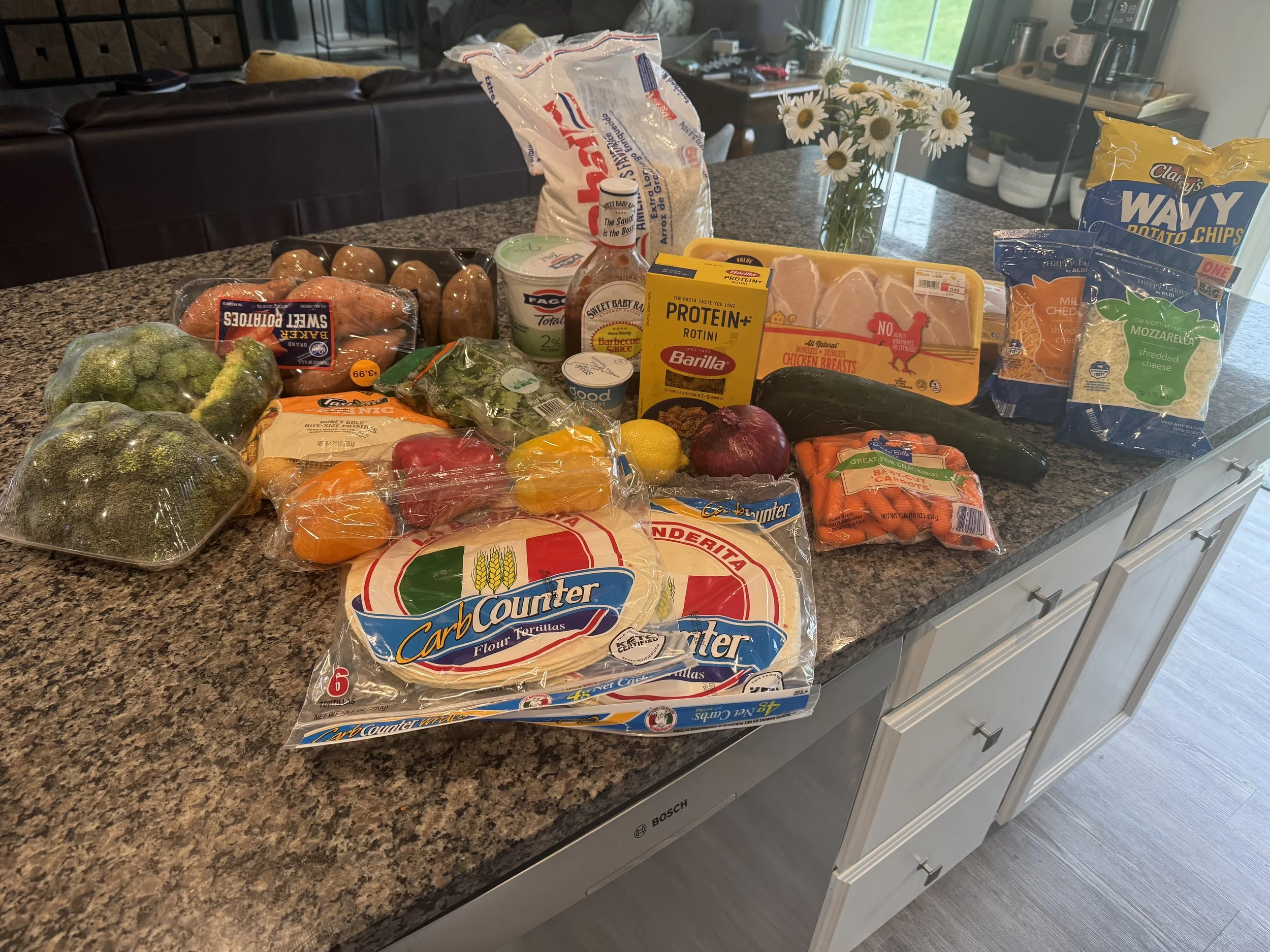 The ingredients for the week are pictured below minus a tomato and cucumber I gathered from the garden later in the week when I needed it. Also, I have also omitted picturing all my seasoning! This will feed my family of 5 for the week with some leftovers!