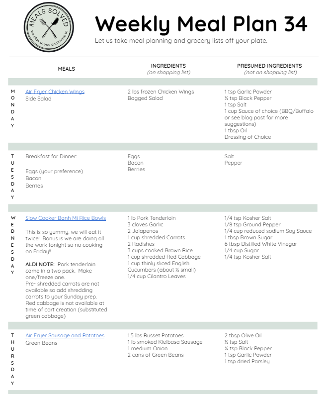 Look through the meal plan table at the ingredients provided in the cart and the presumed ingredients. If you do not have a pantry item, make sure to add it to your cart.
