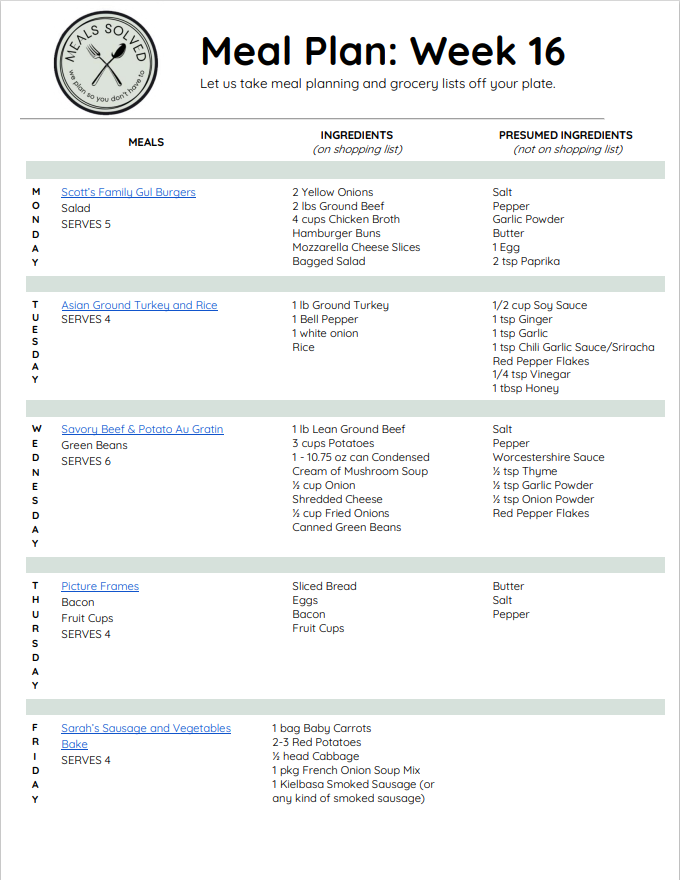 Scott’s Family Gul Burgers with Salad, Asian Ground Turkey and Rice, Savory Beef & Potato Au Gratin, Picture Frames with Bacon and Fruit Cups, Sarah’s Sausage and Vegetable Bake