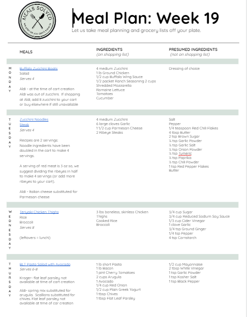 Buffalo Zucchini Boats with Salad; Zucchini Noodles with Steak; Teriyaki Chicken Thighs with Rice and Broccoli; BLT Pasta Salad with Avocado; Spaghetti with Meat Sauce, Garlic Bread, and Broccoli