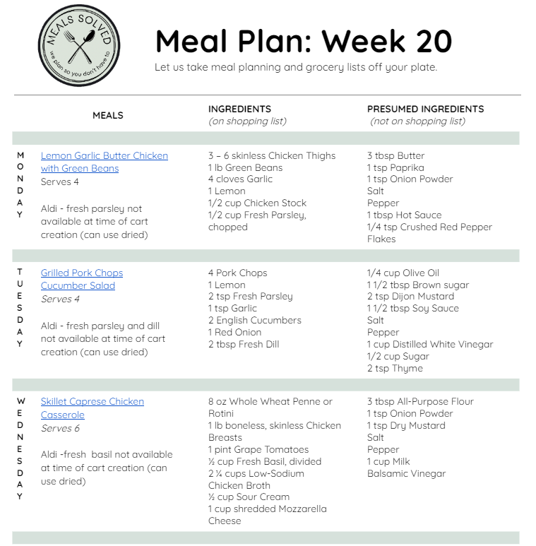 Lemon Garlic Butter Chicken with Green Beans; Grilled Pork Chops with Cucumber Salad; Skillet Caprese Chicken Casserole; Easy Crockpot Buffalo Chicken Sandwiches with Easy Coleslaw; Grilled Ham and Cheese Sandwiches with Chips and Carrots